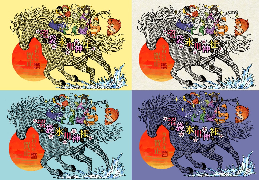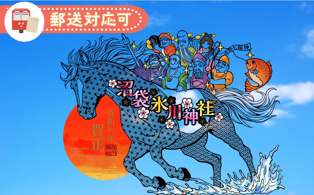 午(うま)は、生命力溢れる「飛躍」の象徴です。物事が「馬(うま)くいく」実り多き年となるよう、人々の願いが力強く前進する一年となるよう祈念されたデザインです。